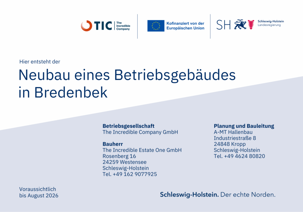 Die The Incredible Company GmbH errichtet in Bredenbek eine neue Gewerbehalle zur Erweiterung ihrer europäischen Distributions- und Logistikkapazitäten für Hautpflege- und Parfümerieprodukte. Ziel des Vorhabens ist es, durch moderne Lager- und Logistiksysteme die Lieferfähigkeit zu verbessern, Lieferzeiten zu verkürzen und weiteres Unternehmenswachstum zu ermöglichen. Mit der Investition werden zudem neue Arbeitsplätze geschaffen und die Wettbewerbsfähigkeit nachhaltig gestärkt.